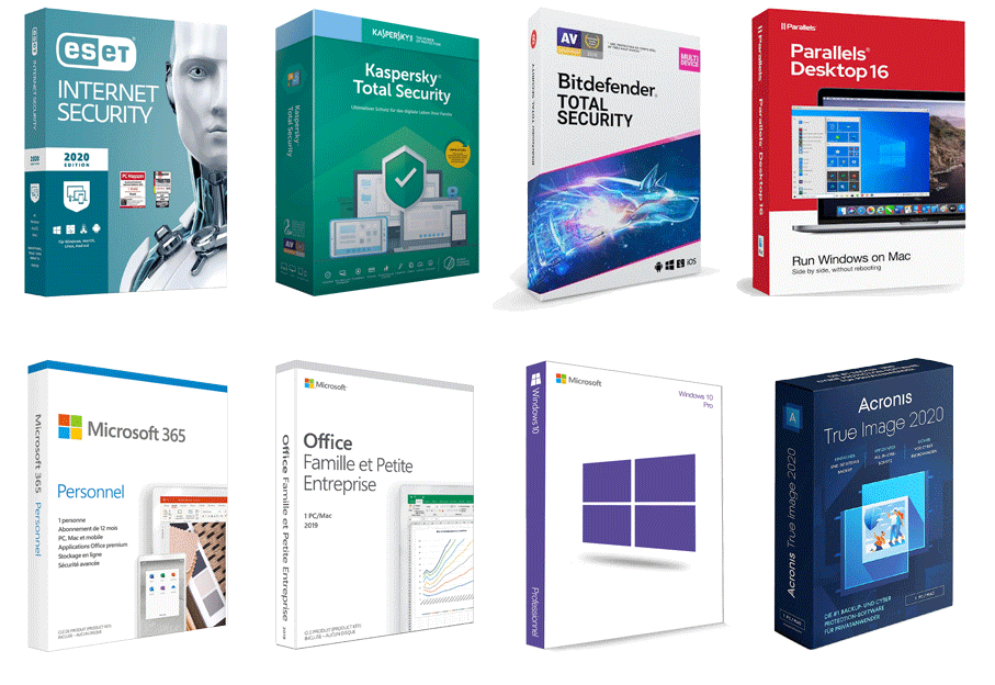Que ce soit les antivirus et pare-feu professionnel pour votre entreprise, la suite bureautique Pack Microsoft Office (Word, Excel, powerpoint, access, publisher, outlook), office 365, office entreprise pour Mac. Les logiciels de virtualisation comme Parallels Desktop, VMware.. Les logiciels de sauvegarde comme Acronis..etc.